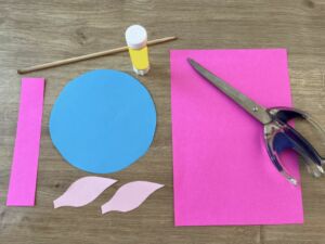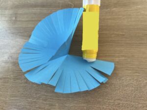 | Mettre un point de colle et rouler le cercle | de manière à former un cône. | Friser les « pétales » à l’aide du baton en bois. |