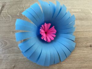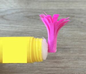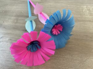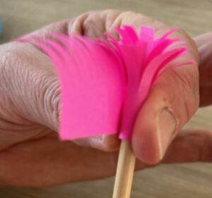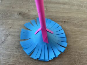 | Rouler la bande sur le bout du baton pour réaliser les étamines. | Mettre un point de colle au bout de la bande et encoller le bas du tube ainsi obtenu. | Le placer au centre de la corolle de pétales. |