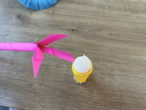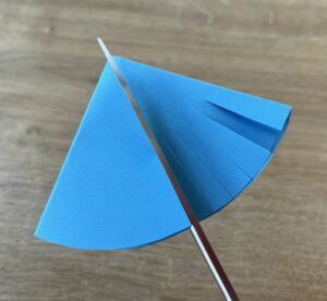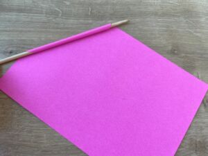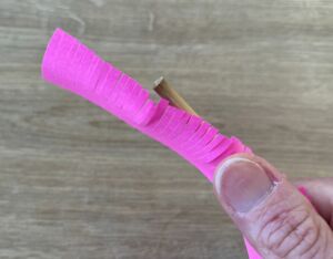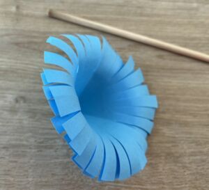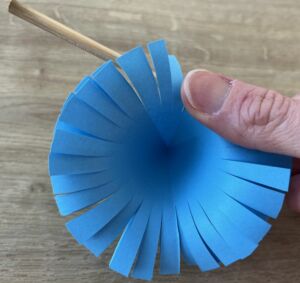 | Rouler en diagonale la feuille A5 autour du baton. | Coller la pointe de la feuille et retirer le baton. | Découper 3 ou 4 encoches à une extrémité de la tige ainsi réalisée. Les encoller. |