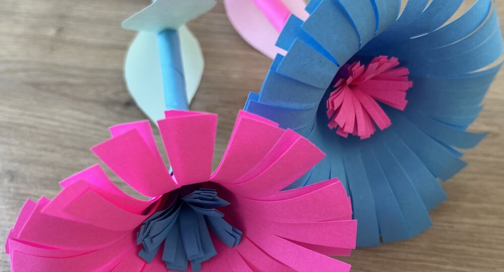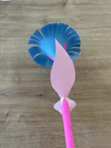 | Et fixer la fleur dessus. | Découper éventuellement une petite encoche à la base des feuilles et les coller sur la tige. | Et voilà ! Vous avez réalisé de jolies fleurs en papier. |