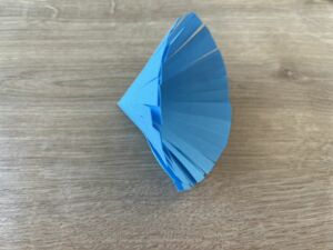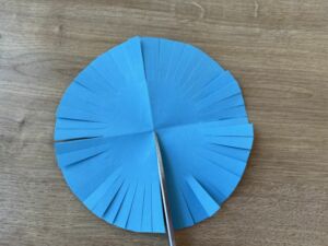 | Découper les morceaux de papier | Plier la feuille en 4 et découper des encoches de la largeur souhaitée en visant le centre du cercle | Faire une encoche jusqu’au centre du cercle |