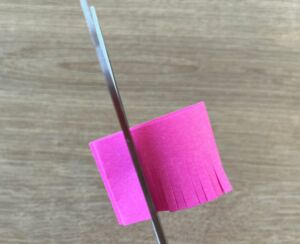 | Vous avez réalisé la corolle de pétales. | Plier la bande de papier en 4, et couper des encoches sur la moitié de la largeur. | Friser les encoches à l’aide du baton en bois. |